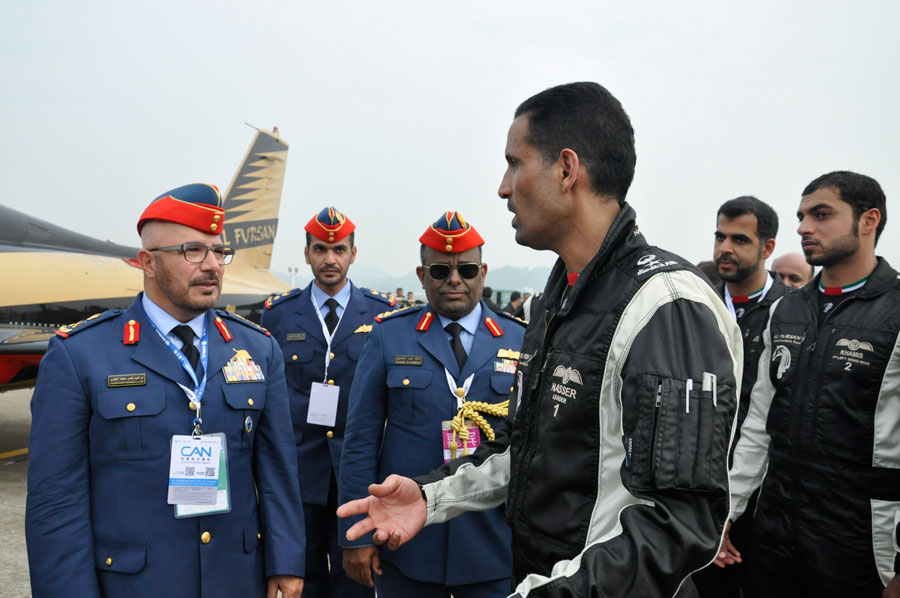 Photo taken on Nov. 11, 2014 shows Commander of the UAE Air Force & Air Defence Major General Staff Pilot Ibrahim Nasser M Al Alawi talks with the leader of the UAE National Aerobatic Team Nasser after its performance at the 10th China International Aviation & Aerospace Exhibition (Airshow China 2014) held from Nov. 11 to 16 in Zhuhai, south China’s Guangdong province. (People’s Daily Online/ Sun Zhao) |