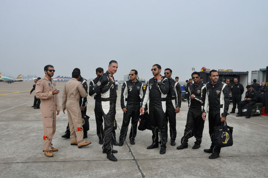 Photo taken on Nov. 11, 2014 shows pilots and mechanics of the United Arab Emirates’ National Aerobatic Team at the 10th China International Aviation & Aerospace Exhibition (Airshow China 2014) held from Nov. 11 to 16 in Zhuhai, south China’s Guangdong province. (People’s Daily Online/ Sun Zhao) |