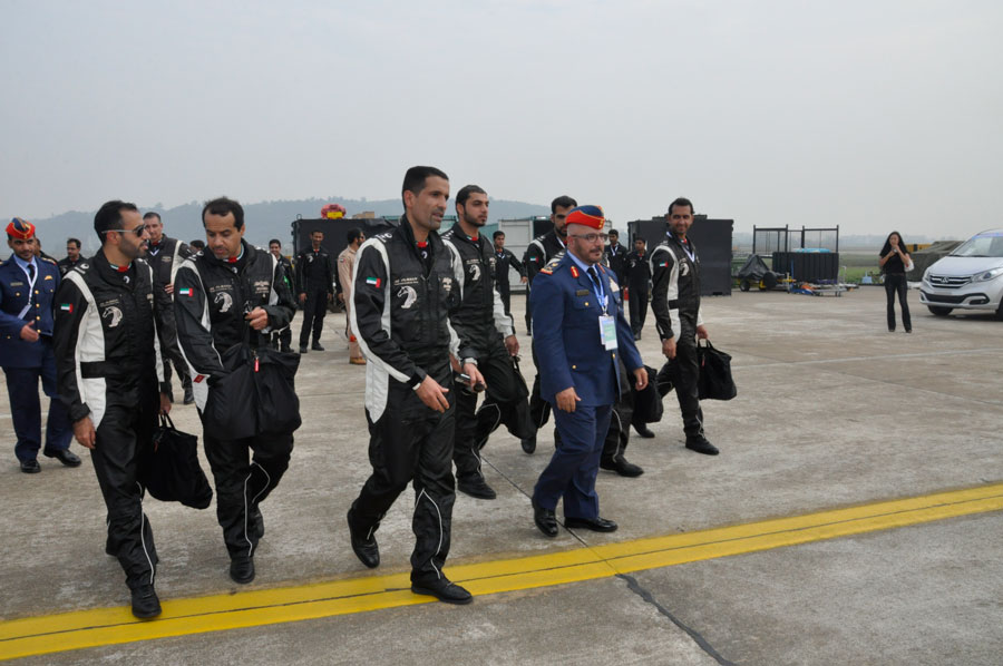 Photo taken on Nov. 11, 2014 shows Commander of the UAE Air Force & Air Defence Major General Staff Pilot Ibrahim Nasser M Al Alawi with the UAE National Aerobatic Team after its performance at the 10th China International Aviation & Aerospace Exhibition (Airshow China 2014) held from Nov. 11 to 16 in Zhuhai, south China’s Guangdong province. (People’s Daily Online/ Sun Zhao) |