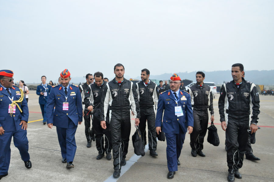 Photo taken on Nov. 11, 2014 shows Commander of the UAE Air Force & Air Defence Major General Staff Pilot Ibrahim Nasser M Al Alawi with the UAE National Aerobatic Team after its performance at the 10th China International Aviation & Aerospace Exhibition (Airshow China 2014) held from Nov. 11 to 16 in Zhuhai, south China’s Guangdong province. (People’s Daily Online/ Sun Zhao) |