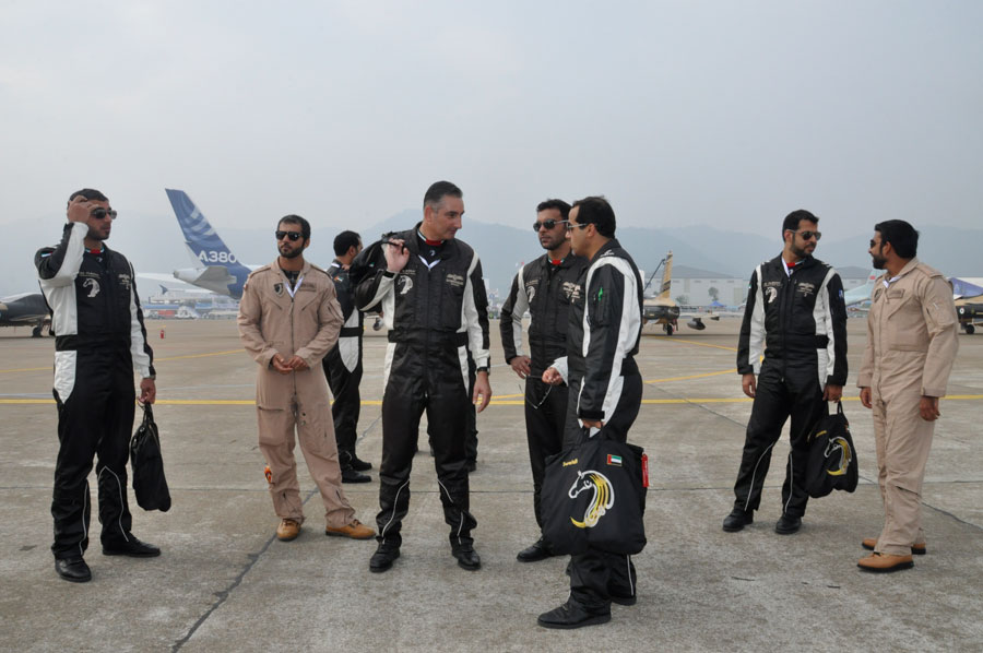Photo taken on Nov. 11, 2014 shows pilots and mechanics of the United Arab Emirates’ National Aerobatic Team at the 10th China International Aviation & Aerospace Exhibition (Airshow China 2014) held from Nov. 11 to 16 in Zhuhai, south China’s Guangdong province. (People’s Daily Online/ Sun Zhao) |