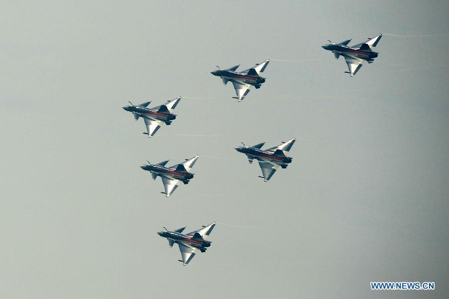 J-10 jet fighters of the Bayi Aerobatic Team of the Air Force of the Chinese People's Liberation Army perform at the 10th China International Aviation and Aerospace Exhibition in Zhuhai, south China's Guangdong province, Nov 11, 2014. This Tuesday marks the 65th anniversary of the establishment of the Air Force of the Chinese People's Liberation Army (PLA). (Xinhua/Shen Ling) |
