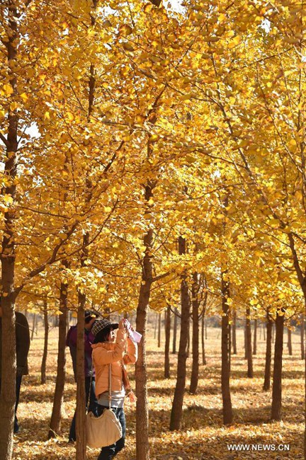 A citizen takes photos at a ginkgo forest in Ji'nan, capital of east China's Shandong Province, Nov. 13, 2014. (Xinhua/Xu Suhui)