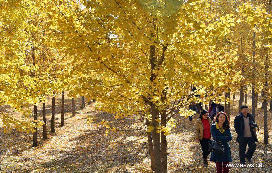 Citizens go sightseeing at a ginkgo forest in Ji'nan, capital of east China's Shandong Province, Nov. 13, 2014. (Xinhua/Xu Suhui)