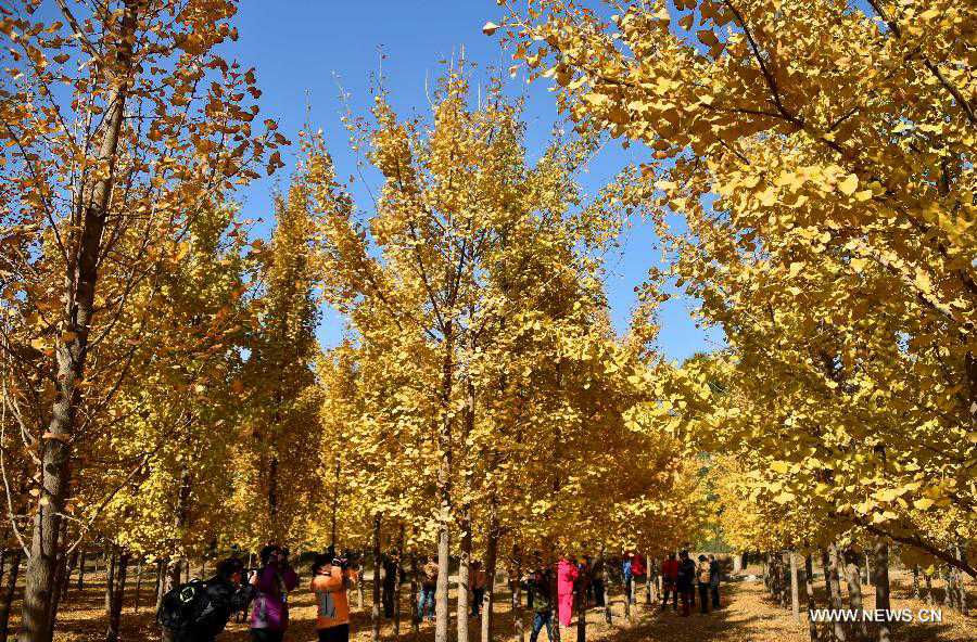 Photography enthusiasts take photos at a ginkgo forest in Ji'nan, capital of east China's Shandong Province, Nov. 13, 2014. (Xinhua/Xu Suhui)