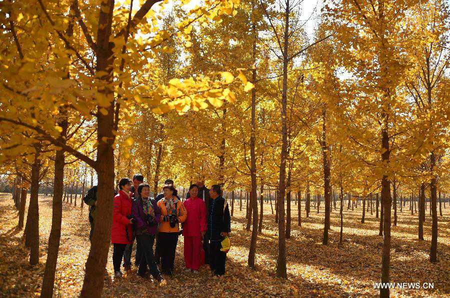 Citizens pose for a group photo at a ginkgo forest in Ji'nan, capital of east China's Shandong Province, Nov. 13, 2014. (Xinhua/Xu Suhui)