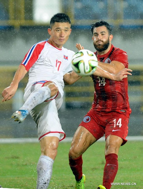 So Hyon Uk (L) of the Democratic People's Republic of Korea (DPRK) vies with Jonathan Jack Sealy of China's Hong Kong during their semifinals round match at the 2015 EAFF East Asian Cup in Taipei, southeast China's Taiwan, on Nov. 13, 2014. DPRK won 2-1. (Xinhua/Lo Ping Fai) |