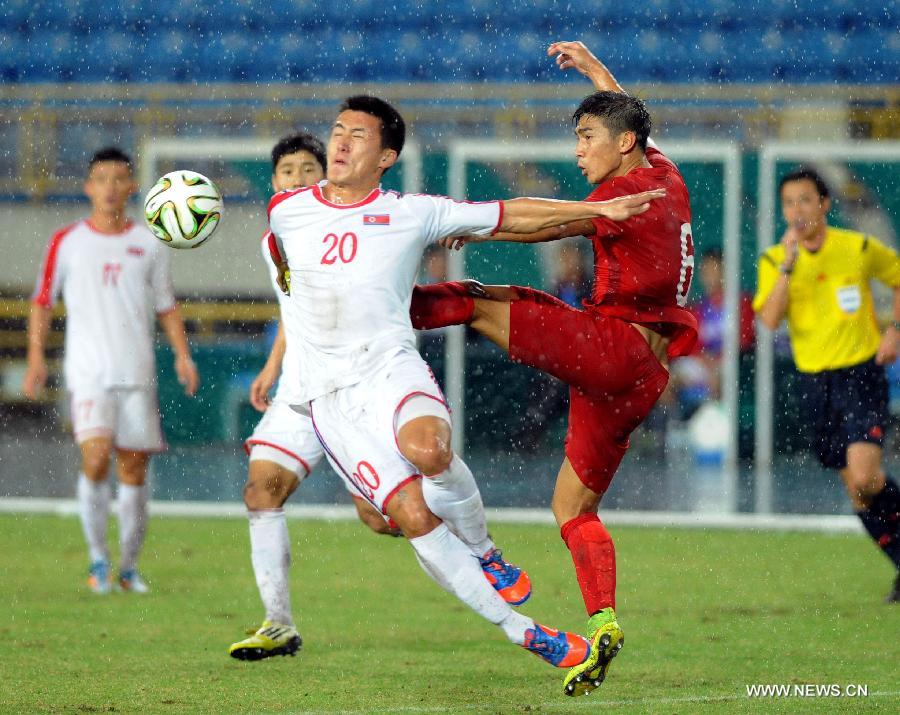 Choe Won (L) of the Democratic People's Republic of Korea (DPRK) vies with Huang Yang of China's Hong Kong during their semifinals round match at the 2015 EAFF East Asian Cup in Taipei, southeast China's Taiwan, on Nov. 13, 2014. DPRK won 2-1. (Xinhua/Lo Ping Fai) |