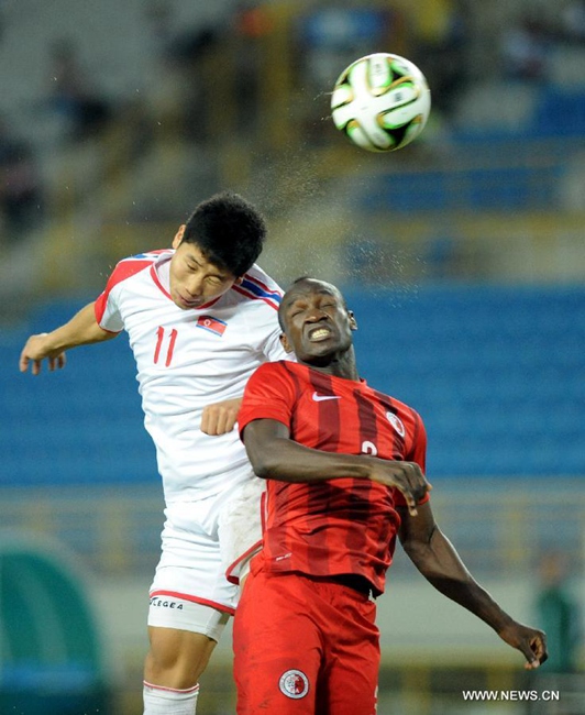 Jong Il Gwan (L) of the Democratic People's Republic of Korea (DPRK) vies for the ball with Agbo Fofo Wisdom of China's Hong Kong during the semifinals round match at the 2015 EAFF East Asian Cup in Taipei, southeast China's Taiwan, on Nov. 13, 2014. DPRK won 2-1. (Xinhua/Lo Ping Fai) |