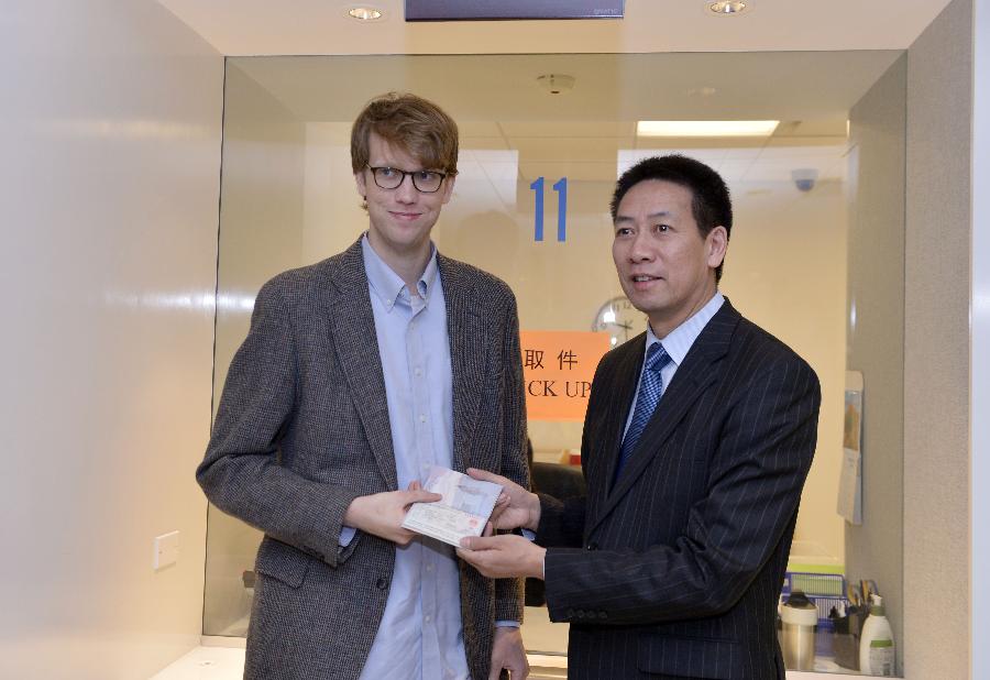 Edmund Thomas Downie (L) receives his long-term visa from Ruan Ping, Consul General at the Chinese Embassy in the U.S., at the Visa Department of the Chinese Embassy to the United States in Washington D.C., Nov. 12, 2014. China issued the first-ever group of visas with ten-year validity to U.S. citizens here on Wednesday, implementing a new agreement that is expected to boost exchange between the two countries. (Xinhua/Yin Bogu) |
