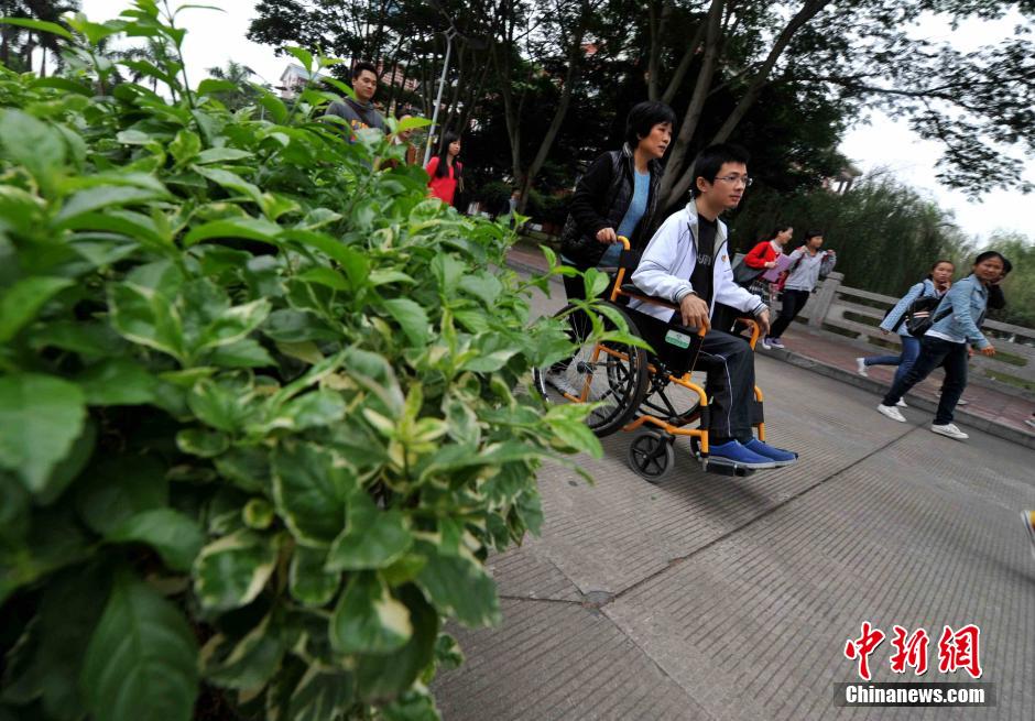 Lai Zhiqiang's mother accompanies him to class, Nov. 11, 2014. (CNS/Zhang Bin)