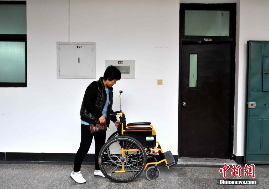 Lai Zhiqiang's mother waits him outside the classroom, Nov. 11, 2014. (CNS/Zhang Bin)