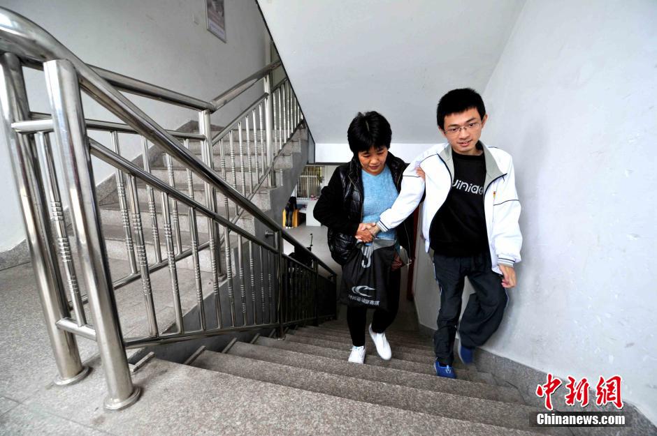 Lai Zhiqiang's mother accompanies him to class, Nov. 11, 2014. He needs more time to go to class from the dorm than his classmates. Therefore, he always leaves the dorm earlier to be on time. (CNS/Zhang Bin)