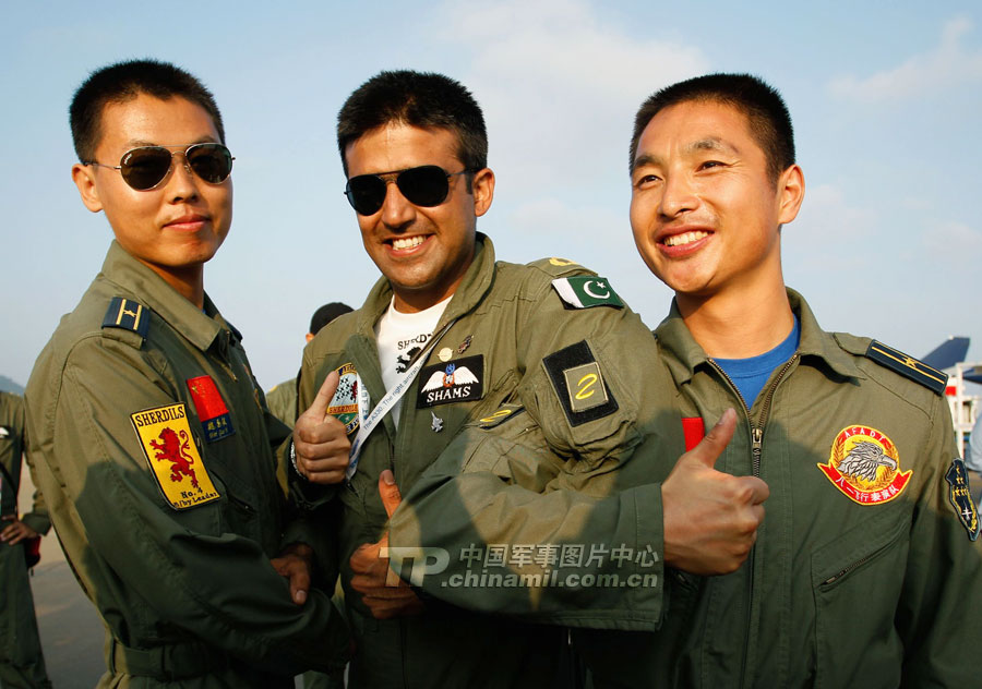 Pilots from August 1st Aerobatics Team takes group photo with pilots from Sherdils, the aerobatics display team of Pakistan at the 8th Airshow China in November 2010. (Photo/Archive)