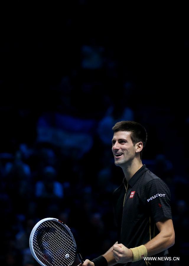 Novak Djokovic of Serbia reacts after the ATP World Tour Finals Group match against Tomas Berdych of the Czech Republic in London, Britain, on Nov. 14, 2014. Djokovic won 2-0. (Xinhua/Han Yan)