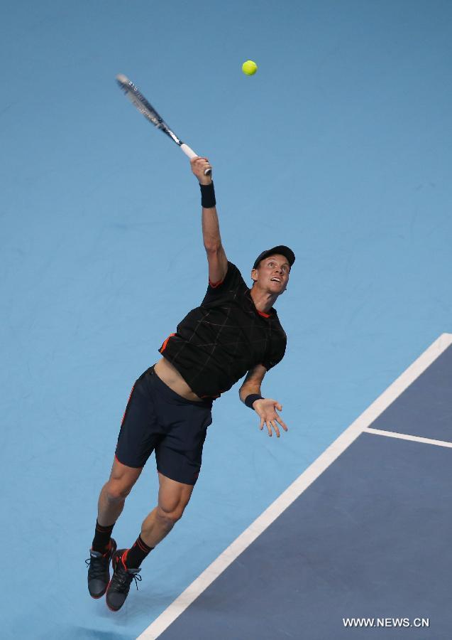 Tomas Berdych of the Czech Republic serves during the ATP World Tour Finals Group match against Novak Djokovic of Serbia in London, Britain, on Nov. 14, 2014. Djokovic won 2-0. (Xinhua/Han Yan)