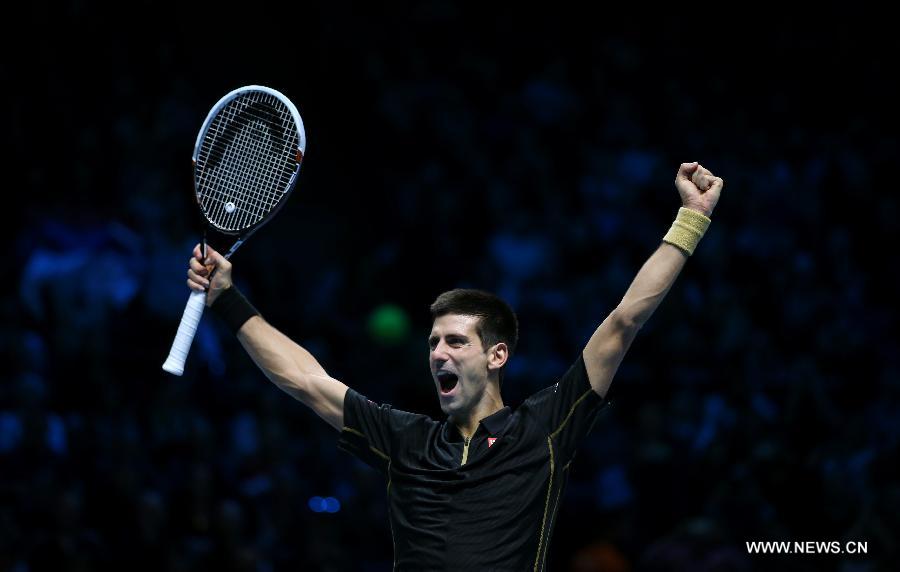 Novak Djokovic of Serbia reacts after the ATP World Tour Finals Group match against Tomas Berdych of the Czech Republic in London, Britain, on Nov. 14, 2014. Djokovic won 2-0. (Xinhua/Han Yan)