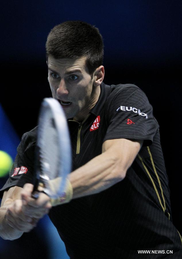 Novak Djokovic of Serbia returns the ball during the ATP World Tour Finals Group match against Tomas Berdych of the Czech Republic in London, Britain, on Nov. 14, 2014. Djokovic won 2-0. (Xinhua/Han Yan)