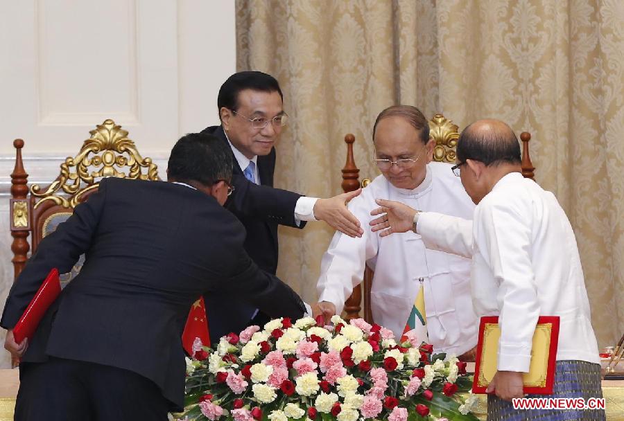 Chinese Premier Li Keqiang (L rear) and Myanmar President U Thein Sein jointly attend a signing ceremony of documents on bilateral cooperation in the realms of business, agriculture, finance and energy sources in Nay Pyi Taw, Myanmar, Nov. 14, 2014. (Xinhua/Ju Peng) |