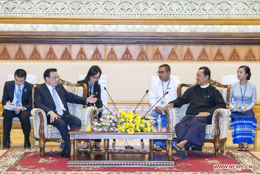Chinese Premier Li Keqiang (L) meets with Thura U Shwe Mann, speaker of Myanmar's Union Parliament and the House of Representatives, in Nay Pyi Taw, Myanmar, Nov. 14, 2014. (Xinhua/Wang Ye)