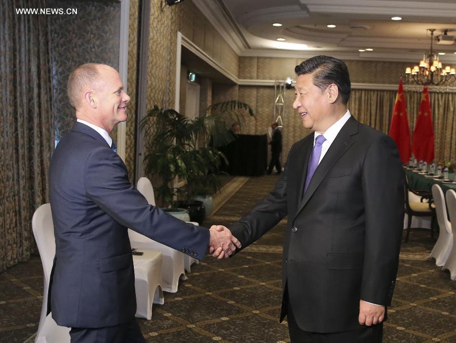 Chinese President Xi Jinping (R) shakes hands with Queensland Premier Campbell Newman during their meeting in Brisbane, Australia, Nov. 16, 2014. (Xinhua/Ding Lin) |