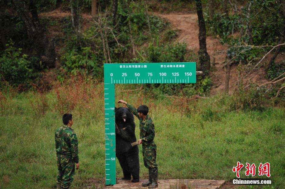 Staff members measure the black bear's height. (CNS/Liu Ranyang)