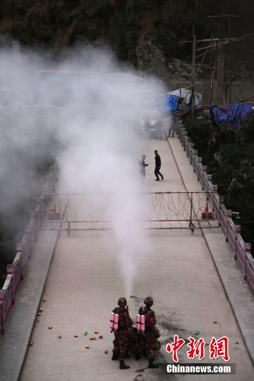 On Nov. 16, 2014, the frontier police force in Tibet and the armed police and fire department of Nepal conduct a joint exercise at the Sino-Nepal Friendship Bridge. The exercise focused on dealing with emergency situations such as attacks at the checkpoints. The joint exercise effectively improved the cooperation ability between the armed police of the two countries. (Chinanews/Zheng Yongbo)