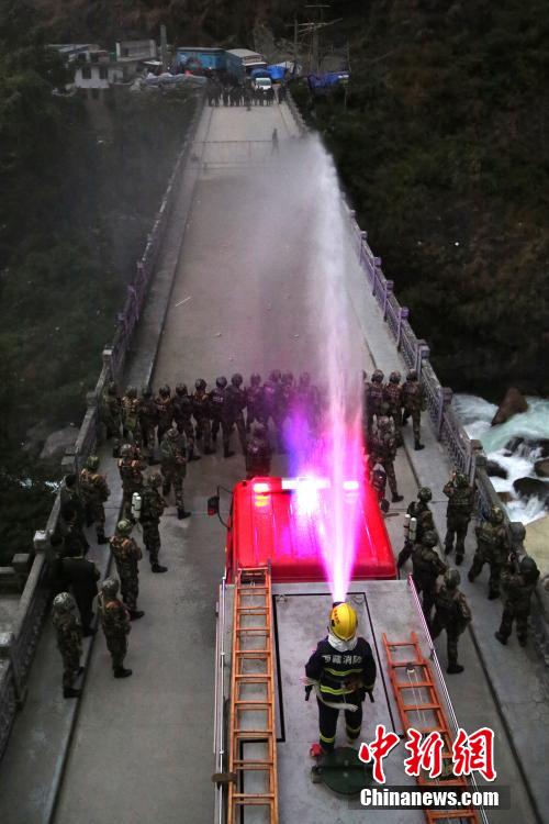 On Nov. 16, 2014, the frontier police force in Tibet and the armed police and fire department of Nepal conduct a joint exercise at the Sino-Nepal Friendship Bridge. The exercise focused on dealing with emergency situations such as attacks at the checkpoints. The joint exercise effectively improved the cooperation ability between the armed police of the two countries. (Chinanews/Zheng Yongbo)