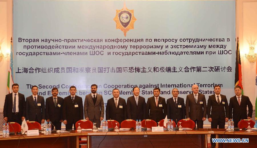 The heads of delegations pose for photo at the Second Conference on Cooperation against International Terrorism and Extremism between SCO Member States and Observer States, in Tashkent, capital of Uzbekistan, on Nov. 18, 2014. (Xinhua/Sadat) |