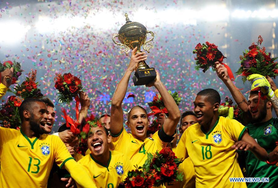 U-22 players of Brazil celebrate with trophy after the International Youth Football Tournament match against China U-22 Team in Wuhan, central China's Hubei Province, Nov. 18, 2014. Brazil defeated China with 2-1 and claimed the title after 2 wins and 1 draw.(Xinhua/Xiao Yijiu) |