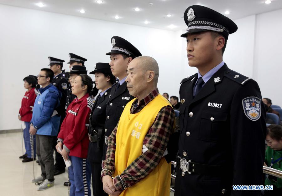 Hu Wanlin (2nd R), a quack Chinese doctor and ex-convict, is on trial at the Luoyang Intermediate People's Court in Luo Yang, capital of central China's Henan Province, Nov. 19, 2014. Hu, who claims himself to be an "omnipotent doctor", was sentenced to 15 years in prison on Wednesday for practicing medicine without a license, which led to the death of a college student. Hu, 65, a native of Mianyang City, Sichuan Province, was sentenced 15 years in prison in 2001 for practising medicine without a license. He was released in 2011 after a term reduction. (Xinhua)