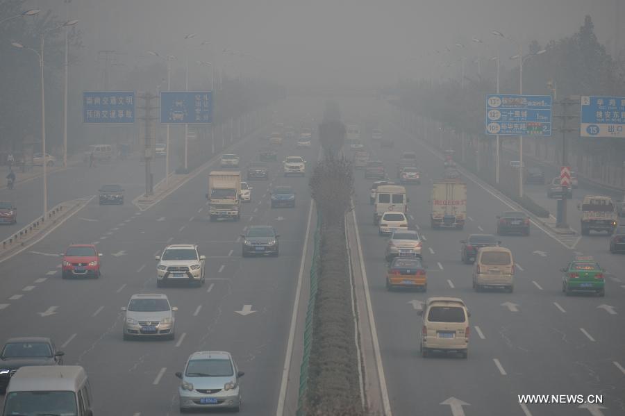 Vehicles run on smog-shrouded road in Shijiazhuang, capital city of north China's Hebei Province, Nov. 19, 2014. (Xinhua/Zhu Xudong)