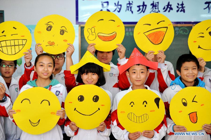 Students demonstrate greeting cards with smiley faces at the No. 10 Middle School in Xingtai, north China's Hebei Province, Nov. 19, 2014, ahead of the World Hello Day which falls on Nov. 21. (Xinhua/Zhu Xudong)