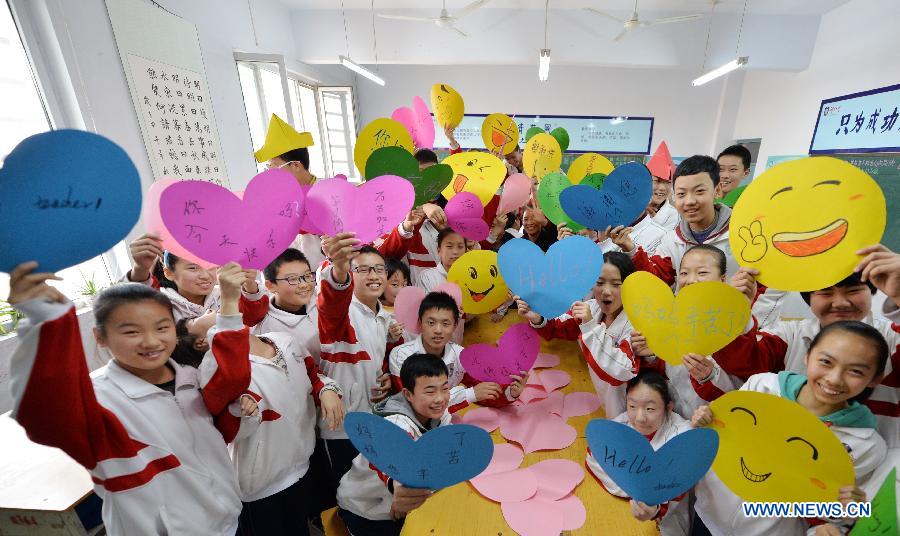 Students demonstrate various greeting cards at the No. 10 Middle School in Xingtai, north China's Hebei Province, Nov. 19, 2014, ahead of the World Hello Day which falls on Nov. 21. (Xinhua/Zhu Xudong)