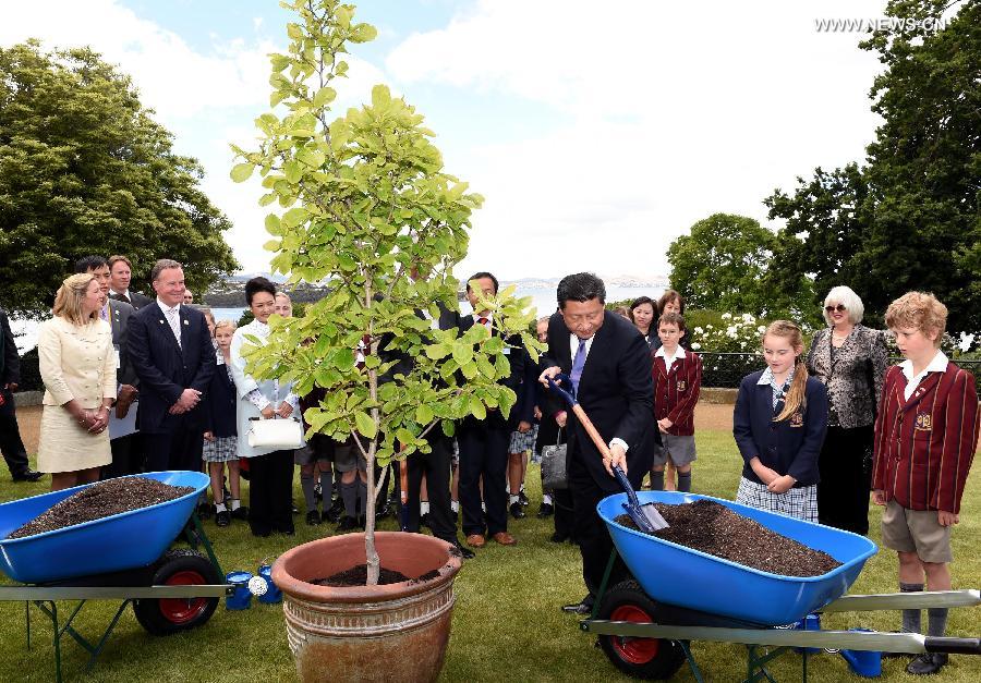 Chinese President Xi Jinping plants a tree with students of a primary school in Tasmania state, Australia, Nov. 18, 2014. (Xinhua/Rao Aimin)