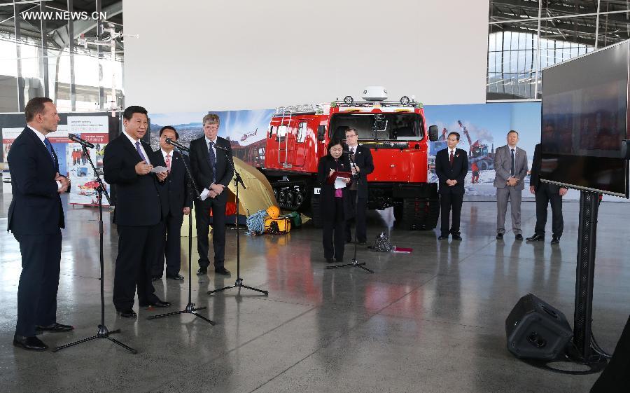 Chinese President Xi Jinping (2nd L) and Australian Prime Minister Tony Abbott (1st L) speak via live video with scientists of both countries stationed at the South Pole, respectively from Australia's Davis Station and China's Zhongshan Station, in Hobart, Australia, Nov. 18, 2014. (Xinhua/Yao Dawei) |