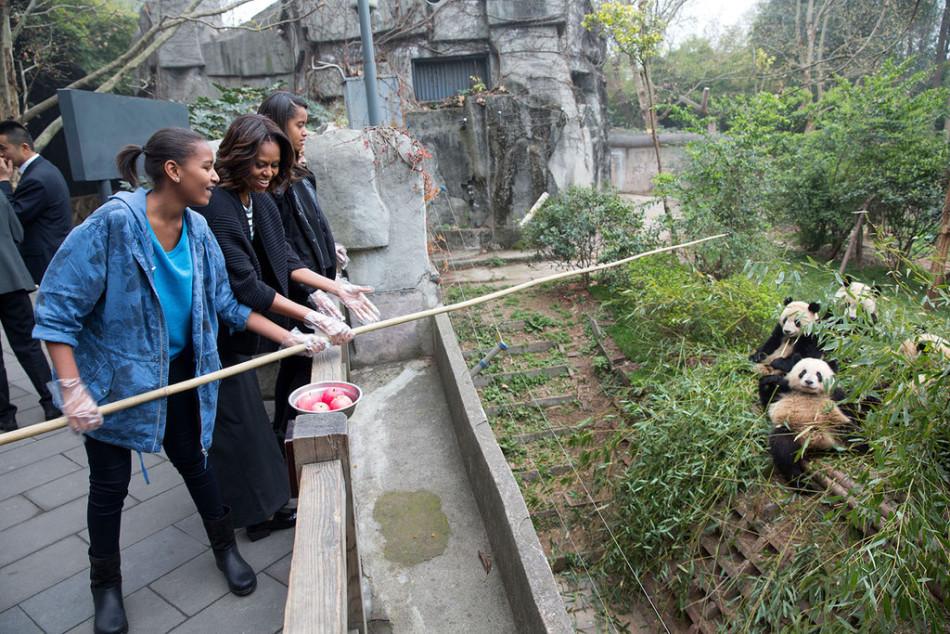 U.S. First Lady Michelle Obama visits the base of giant pandas in Chengdu, March 26, 2014. (Photo/Xinhuanet)