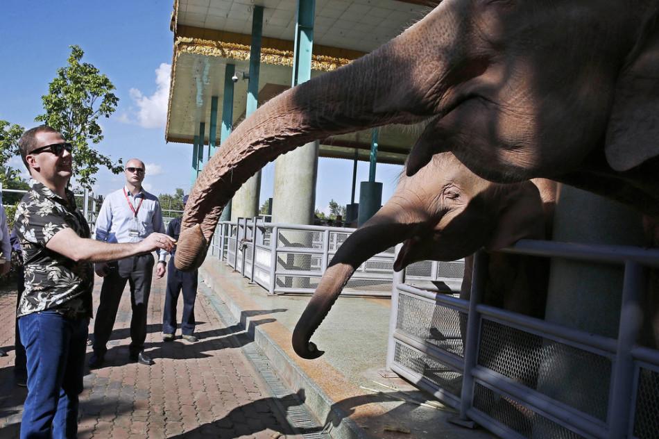 Dmitry Medvedev, prime minister of Russia, feeds elephants at a local zoo in Naypyidaw, Myanmar, Nov. 13, 2014. (Photo/Xinhuanet)