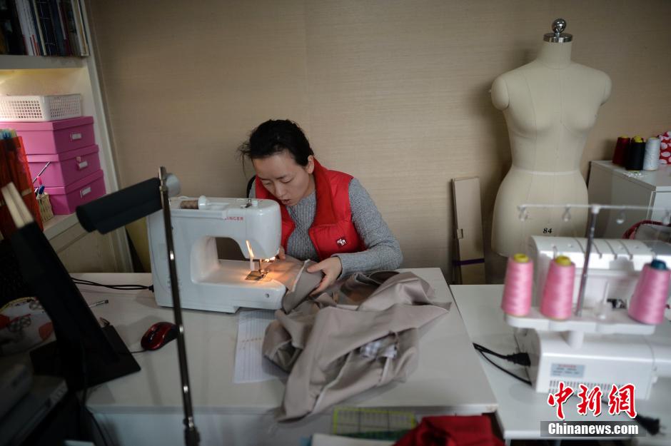 Wang Yi makes clothes for her daughter. (Chinanews/Yu You)