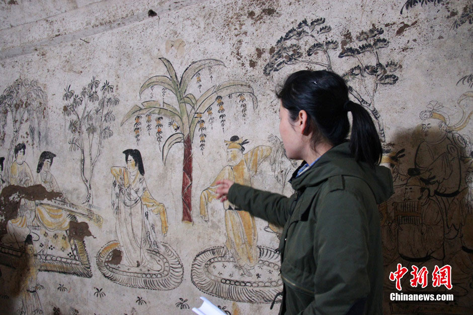 According to news released by Shaanxi Provincial Institute of Archeology on Nov. 18, 2014, the excavation of the joint tomb of Chancellor Han Xiu and his wife of Tang Dynasty (618-907) has finished. Hundreds of cultural relics were excavated, including epitaph, tomb figures and exquisite frescoes that are still colorful after over 1,000 years. The landscape painting on the north wall of the coffin chamber is the earliest Tang fresco on a single wall discovered so far. (Chinanews/Zhang Yuan)