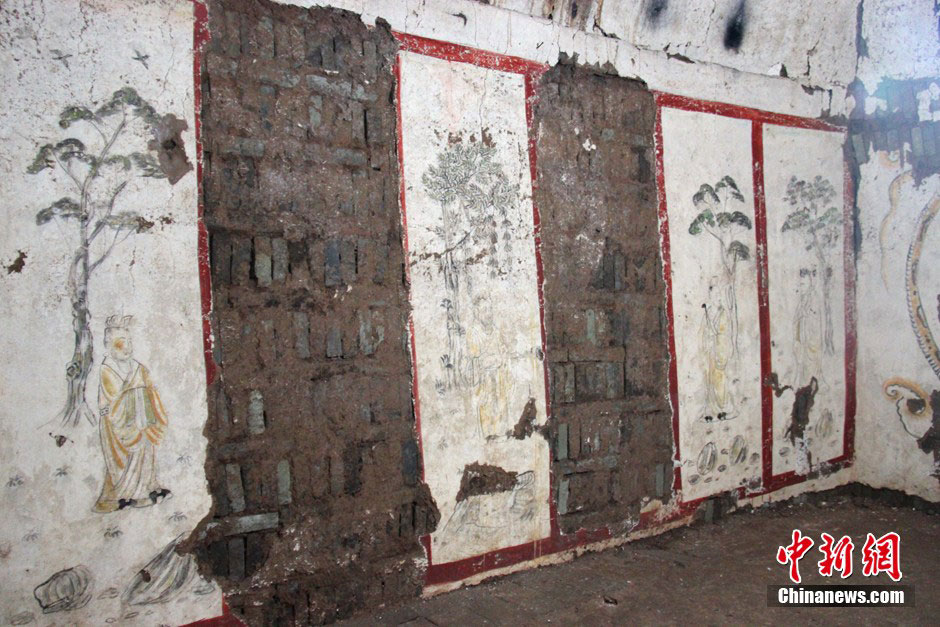 According to news released by Shaanxi Provincial Institute of Archeology on Nov. 18, 2014, the excavation of the joint tomb of Chancellor Han Xiu and his wife of Tang Dynasty (618-907) has finished. Hundreds of cultural relics were excavated, including epitaph, tomb figures and exquisite frescoes that are still colorful after over 1,000 years. The landscape painting on the north wall of the coffin chamber is the earliest Tang fresco on a single wall discovered so far. (Chinanews/Zhang Yuan) |