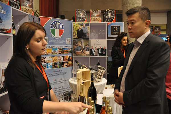 A staff member from an Italian wine company introduces wines for a Chinese customer at the annual 100ITA Project Global Event in Italian Embassy, Beijing, Nov. 17, 2014. (People’s Daily Online/Ma Xiaochun)