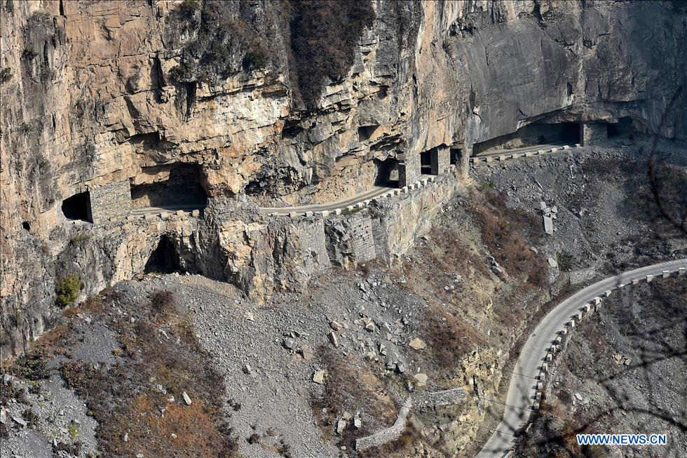 Photo taken on Nov. 19, 2014 shows a general view of a road built on the cliff of the Taihang Mountains in Lingchuan County, north China's Shanxi Province. The 7.5-kilometer road, linking a mountainous villagewith county town, looks like hanging on a wall from afar.(Xinhua/Zhan Yan) |