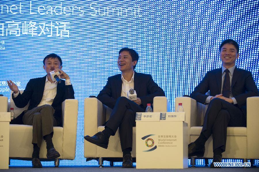 Ma Yun (L), founder and chairman of China's leading e-commerce company Alibaba Group, Co-founder, Chairman and CEO of Chinese search engine Baidu Li Yanhong (C), and Liu Qiangdong (R), CEO of e-commerce company JD.com, attend the Chinese and Foreign Internet Leaders Summit during the World Internet Conference in Wuzhen, east China's Zhejiang Province, Nov. 20, 2014. Representatives from nearly 100 countries and regions took part in the three-day 2014 World Internet Conference that kicked off Wednesday in Wuzhen. (Xinhua/Ju Huanzong)