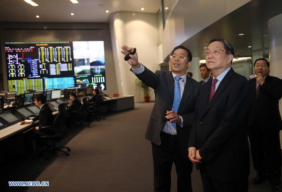 Yu Zhengsheng (R Front), chairman of the National Committee of the Chinese People's Political Consultative Conference, inspects the control center of the State Grid before a launch ceremony of power transmission between southwest China's Tibet Autonomous Region and Sichuan Province, in Beijing, capital of China, Nov. 20, 2014. (Xinhua/Liu Weibing) |