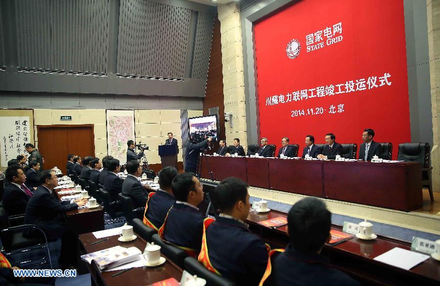 Yu Zhengsheng(4th R), chairman of the National Committee of the Chinese People's Political Consultative Conference, attends a ceremony held to launch the operation of power lines linking southwest China's Tibet Autonomous Region to Sichuan Province, in Beijing, capital of China, Nov. 20, 2014. (Xinhua/Liu Weibing) |