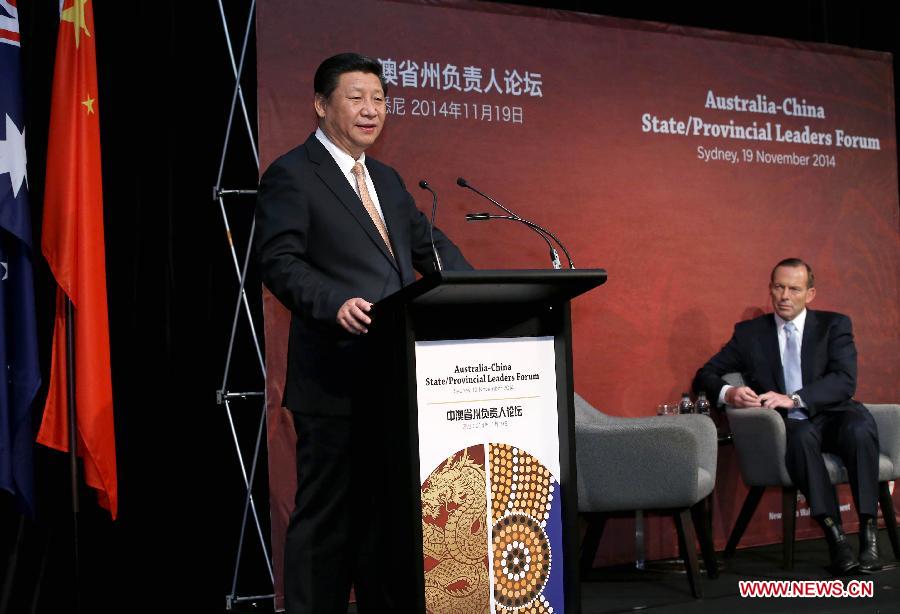 Chinese President Xi Jinping (L) delivers a speech as he attends the first China-Australia Provincial/State Leaders Forum along with Australian Prime Minister Tony Abbott (R) in Sydney, Australia, on Nov. 19, 2014. (Xinhua/Pang Xinglei) |