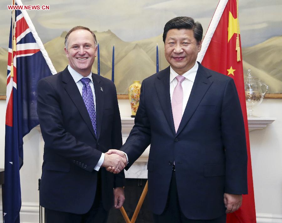 Chinese President Xi Jinping (R) shakes hands with New Zealand's Prime Minister John Key in Wellington, New Zealand, Nov. 20, 2014. Xi Jinping and John Key held talks in Wellington on Thursday. (Xinhua/Yao Dawei)