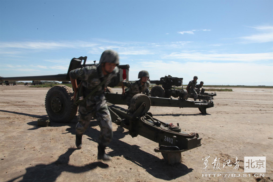 In this autumn, a field artillery brigade of the 27th Group Army of the PLA maneuvers from northwest China to the beach of the Bohai Sea to conduct a live-fire drill and successfully hit a dozen of mobile targets on the sea. (BJ.81.cn/Chang Tianlong) |