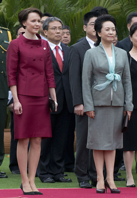 Peng Liyuan welcomes the first lady of Finland. (Photo/ forum.china.com.cn)